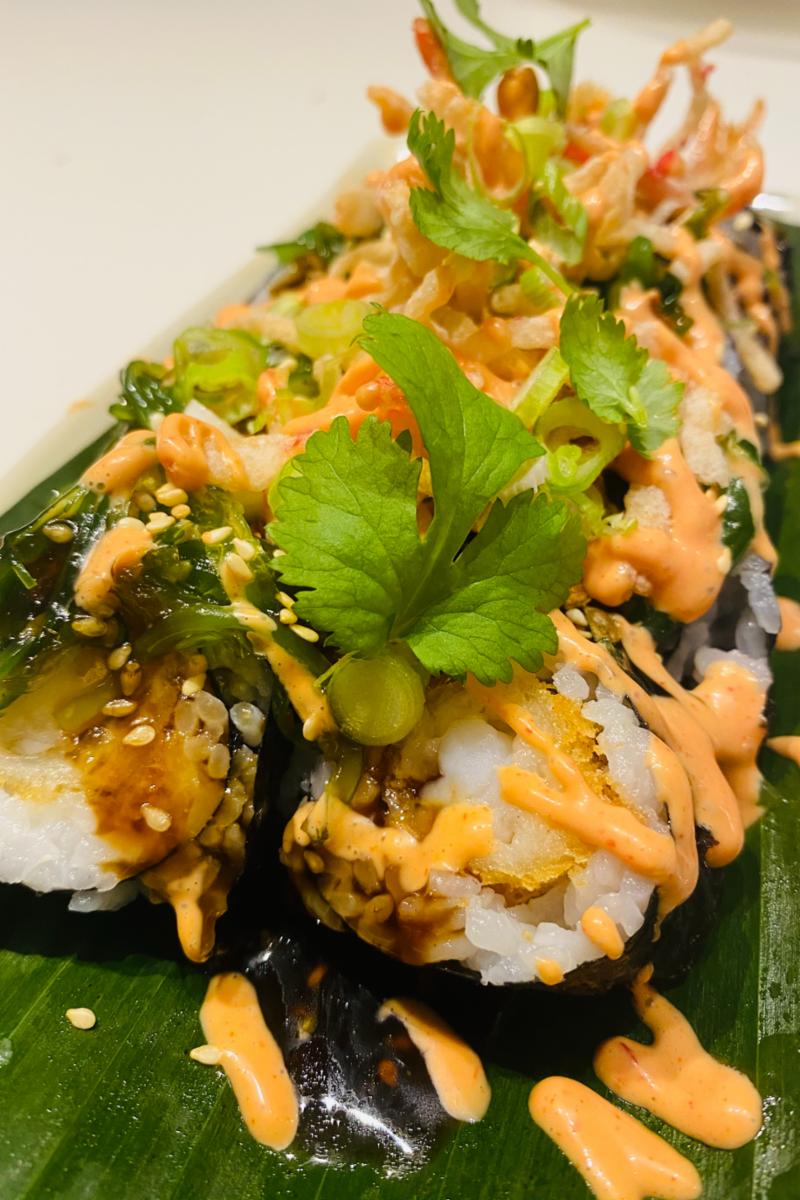 10 Hot & Dirty biter fylt med tempura scampi. Toppet med syltet ingefær, wakame, sprø løk, vårløk, sesamfrø, rød og sort tobikko, wasabi majones, Teriaki saus og chili majones. Chilimajones er veldig sterk så om du vil ha den mindre sterk så skriv at du vil ha mindre eller ingen majones.