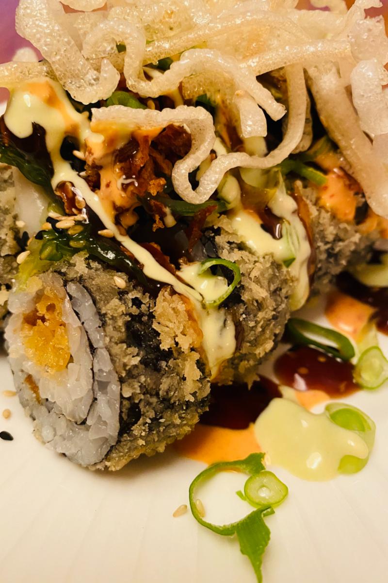 10 Hot & Dirty biter salmon, Toppet med syltet ingefær, wakame, sprø løk, vårløk, sesamfrø, rød og sort tobikko, wasabi majones, Teriaki saus og chili majones. Chilimajones er veldig sterk så om du vil ha den mindre sterk så skriv at du vil ha mindre eller ingen majones.