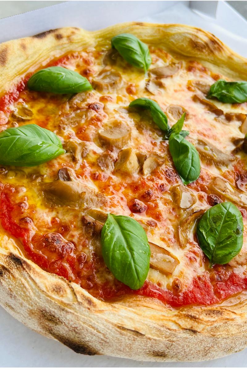 Surdeigspizza med tomatsaus, revet mozzarella, steinsopp, olivenolje og basilikum.