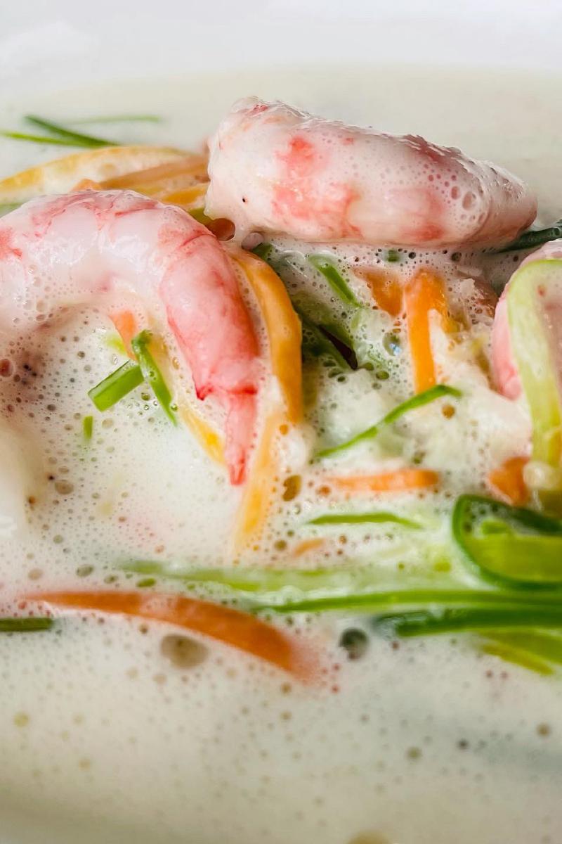 Kremet fiskesuppe med hvit fisk, store reker, blåskjell og rotgrønnsaker. Godt brød og smør.