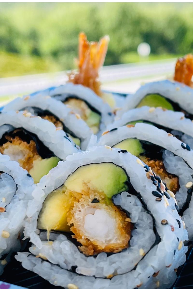 10 biter tempura special. Fylt med tempura scampi, mango, chili og avocado. Kim chee sesam frø.