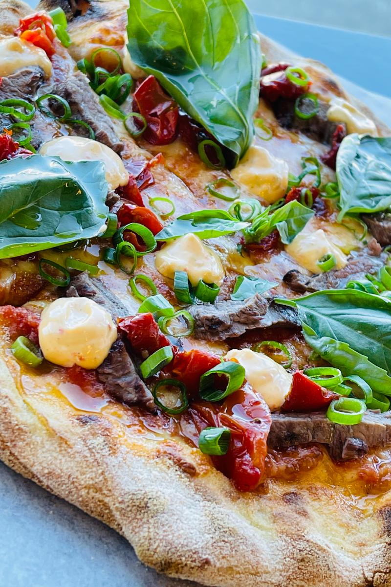 Surdeigspizza med tomatsaus, revet mozzarella, Grillet indrefilet, bearnaisemajones, vårløk, semitørket cherrytometer, olivenolje og basilikum.