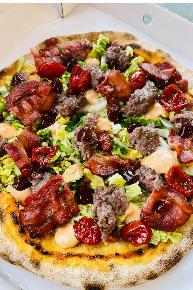 Surdeigsbunn stekes med cheddar og mozzarella. Vi griller burgerkjøttet på yakatori grillen og legger dette på sammen med sprøtt bacon, tomater, salat og dressing. Helt magisk.