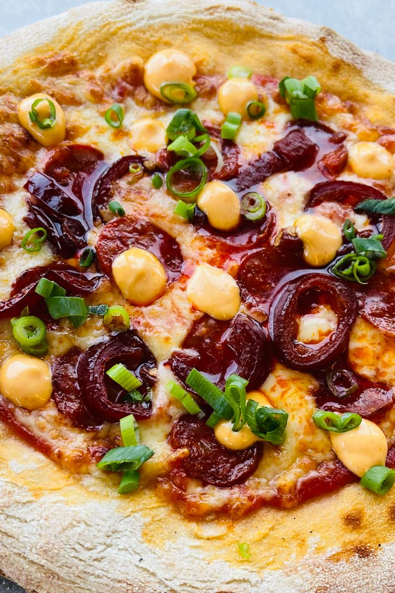 En deilig surdeigs pizza vi topper tomatsaus, mozzarella, chorizo, vårløk og California reaper.