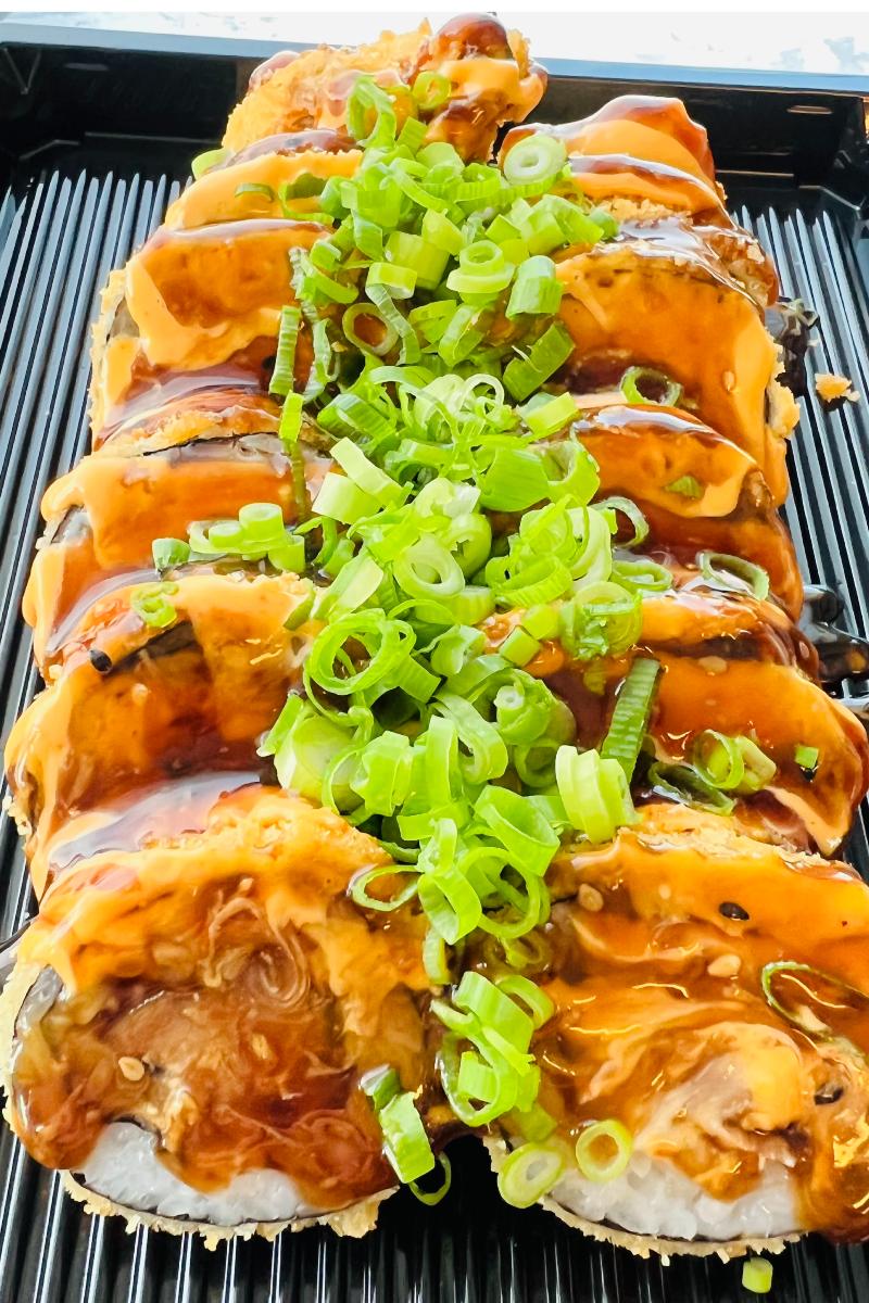 Toppet med Teriyaki saus og chilimajones. Frisk vårløk og syltet ingefær.