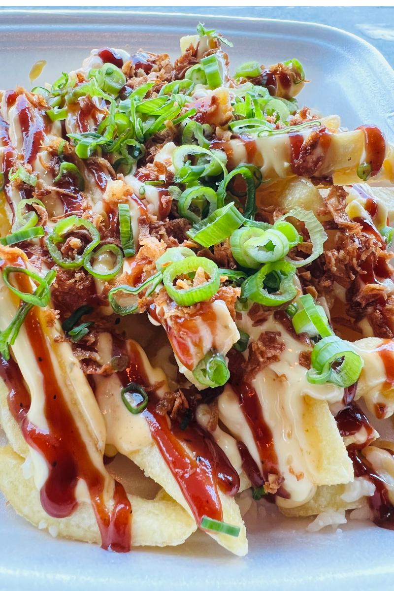 Vi friterer fries og topper dette med kvitløks majones, chili majones, BBQ saus, Bearnaise majones, sprø løk (hvete), mozzarella og vårløk.